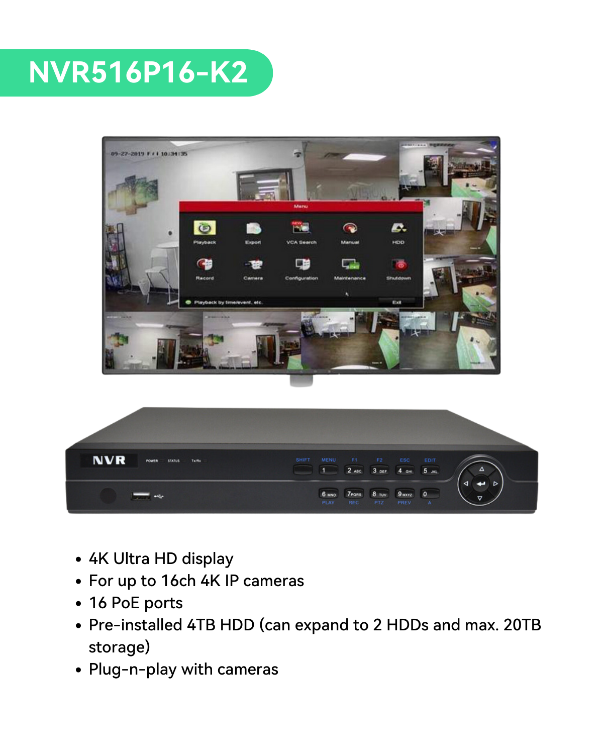 4K 16CH Ultra HD NVR with 4TB HDD, H.265+ Compression