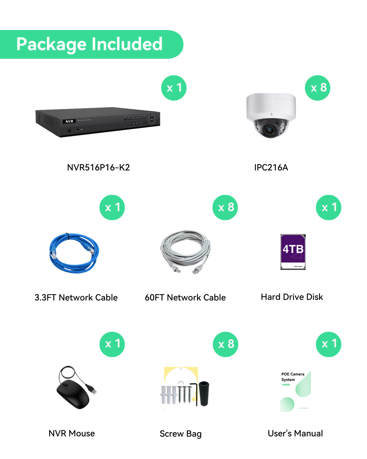 4K(16CH) 4TB PoE NVR System with 8*6MP Night Vision PoE Dome Security Cameras