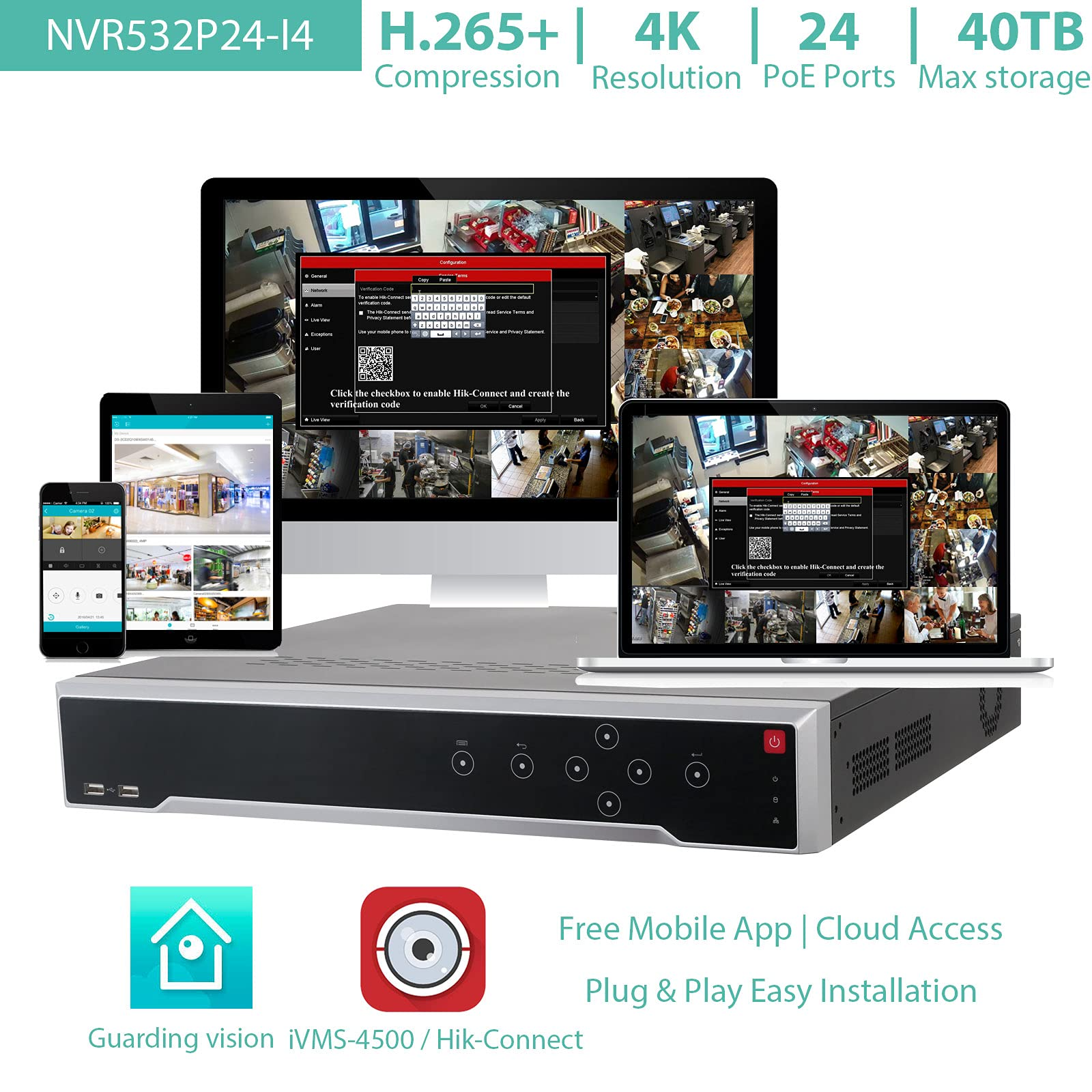 - 4K 32CH ULTRA HD NVR WITH 8TB SECURITY GRADE HDD: 4x clearer than 1080p live viewing and recording, H.265+ video compression and most powerful functions. Provide 24 independent PoE interfaces, transmission up to 900ft from POE cams.Supports hard drive with maximum storage capacity of 4 SATA interfaces, with total 40TB storage capacity. (one 8TB HDD is pre-installed).