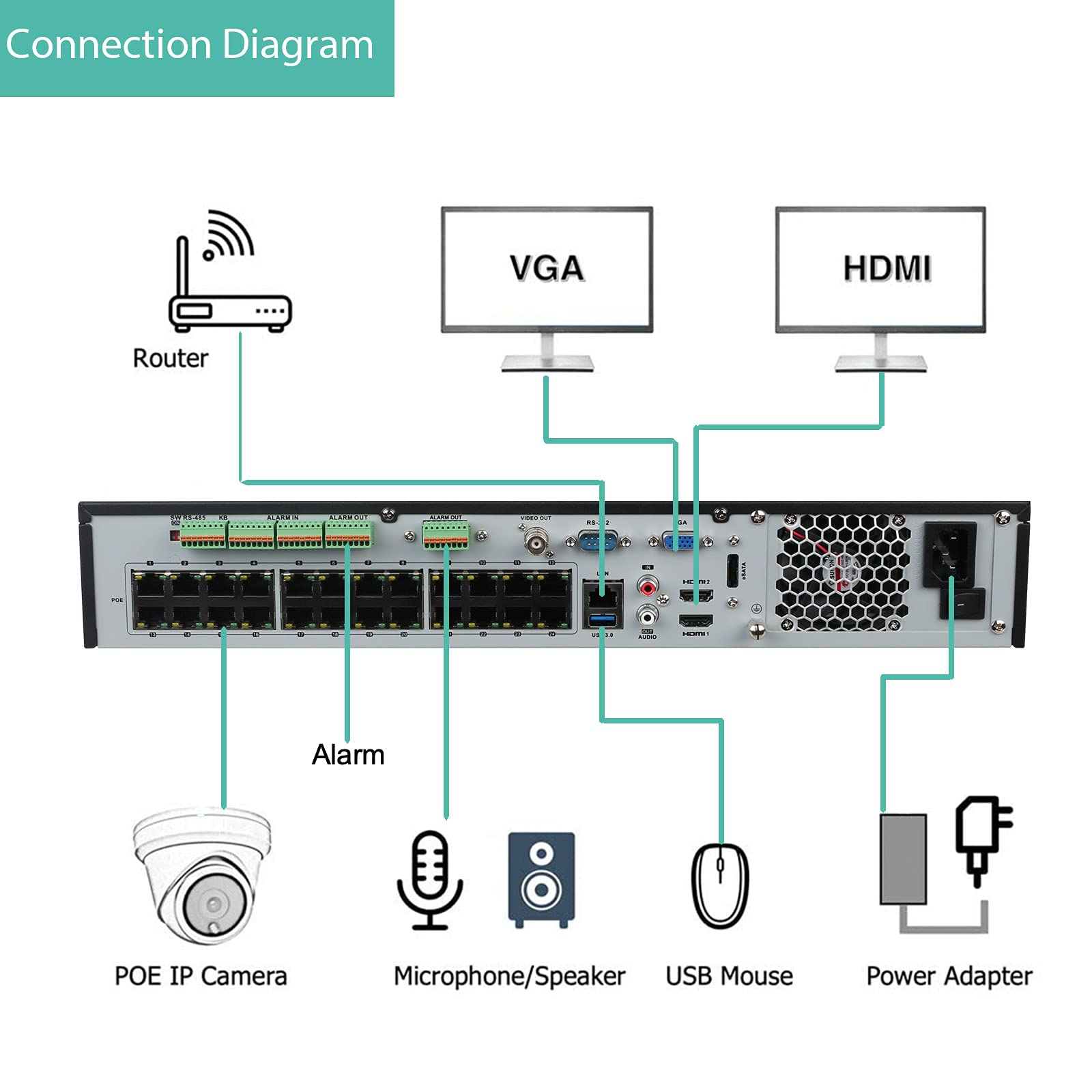 - PLUG-N-PLAY:Just plug cameras to NVR’s POE ports and it works; Camera get POE power and transmit video to NVR via one network cable; No extra power adapters is required; No complicated configuration is needed. The security system is designed for anyone without expertise.
